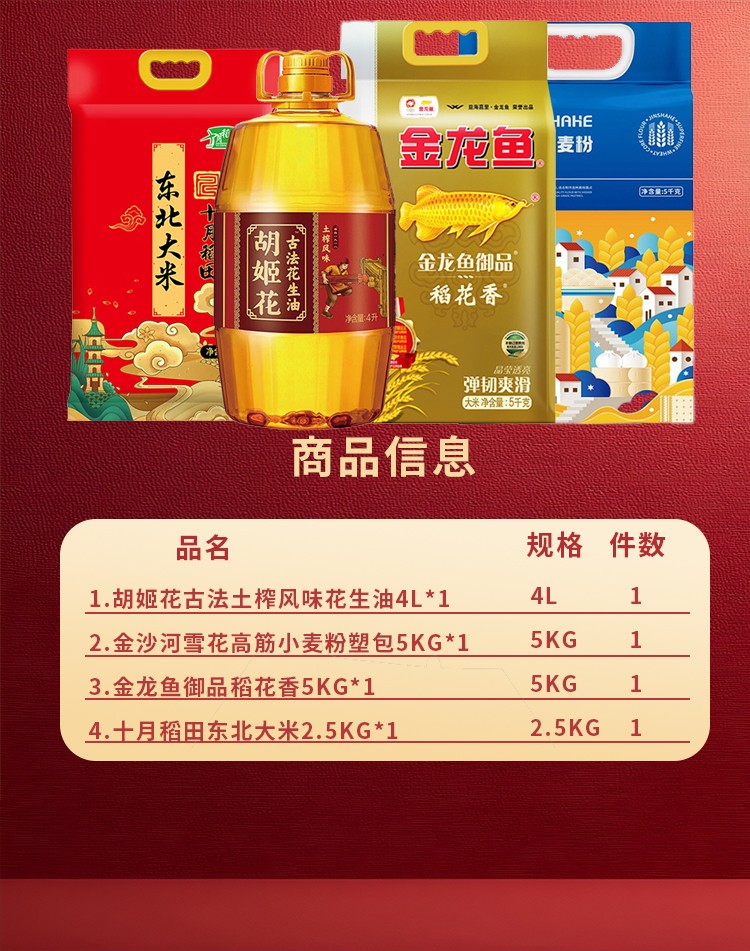 首页 > 粮油系列 > 胡姬花/金沙河/金龙鱼/十月稻田东北大米御品稻花香高筋小麦粉土榨花生油组合12.5kg+4L