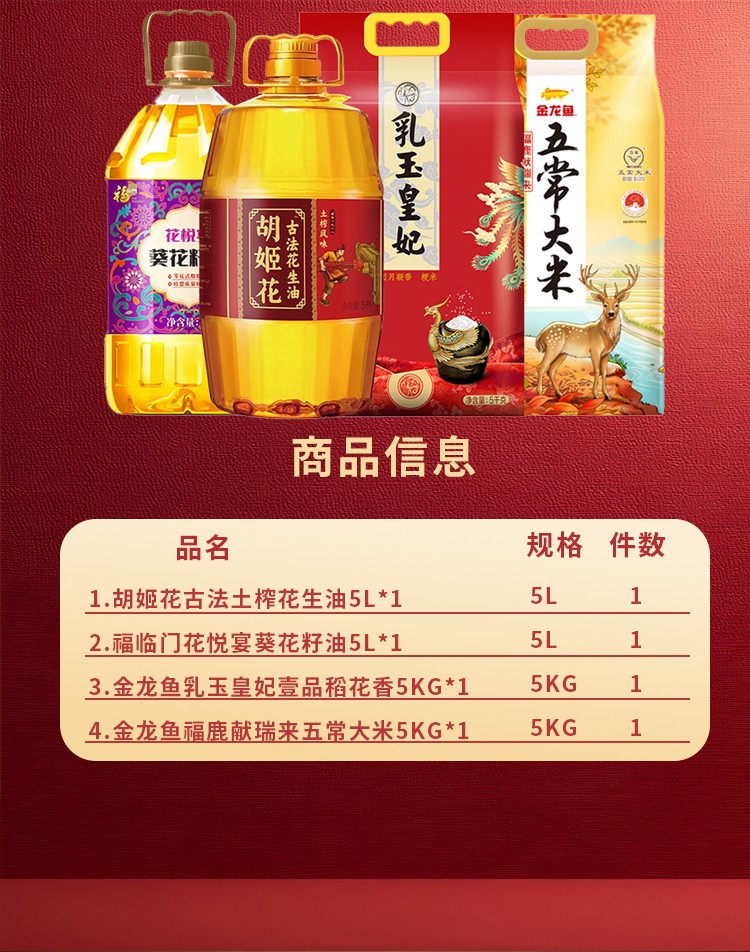 首页 > 粮油系列 > 金龙鱼/胡姬花/福临门花悦宴花生油壹品稻花香米五常大米组合10L+10kg